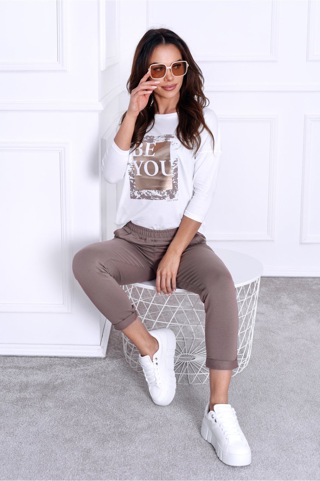 Bluzka damska z błyszczącym nadrukiem i logotypem. Obniżona linia ramion oraz rękaw 3/4.Casualowa bluzka, która świetnie sprawdzi się do spodni jak i spódnicy.