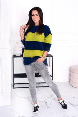 Sweter damski w szerokie pasy. Posiada rękaw 3/4, który tak jak dekolt oraz dół sweterka jest zakończony ozdobnym przeszyciem ściągaczowym. Wykonany z przyjemnej w dotyku przędzy.