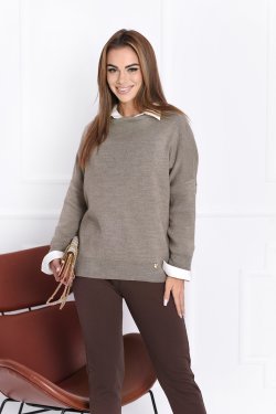 Klasyczny sweter damski z długim rękawem oraz lekko opadającymi ramionami. Ciekawym wykończeniem sweterka jest płytki półgolf przy szyi. Posiada małą ozdobę w postaci okrągłej blaszki z logo Off Pink. Uroczy w swojej prostocie.