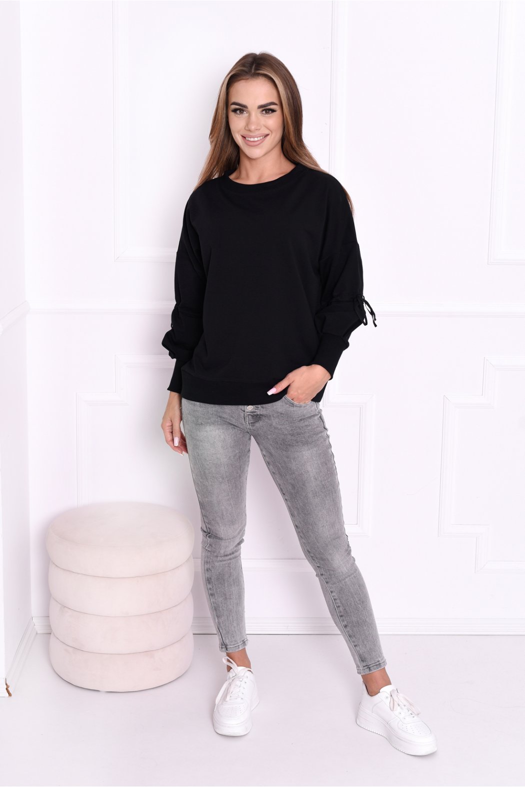 Bluza damska uszyta z przyjemnej w dotyku bawełny. Model z opuszczoną linią ramion. Posiada poziome ściąganie troczkiem w rękawie. Dodatkowo dół bluzy, dekolt oraz rękawy zakończone ściągaczem.
