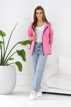 Rozpinana bluza damska z kapturem. Ma zaokrąglony, lekko przedłużony tył. Model z możliwością regulacji obwodu. Z przodu posiada dwie kieszenie i czarną naszywkę z napisem "OFF PINK". Bluza jest stworzona dla kobiet, które uwielbiają sportowe stylizacje.