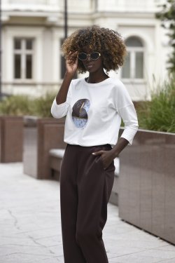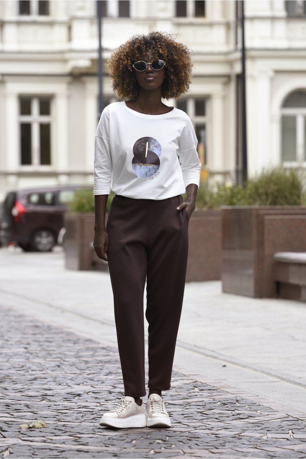 Bluzka damska z rękawem o długości 3/4. Na przodzie znajduje się nadruk ze złotymi akcentami, które nadają bluzce delikatny blask. Dolna część bluzki jest zakończona prostą linią, która pozwala na różne sposoby noszenia – zarówno włożoną do spodni, jak i na zewnątrz.