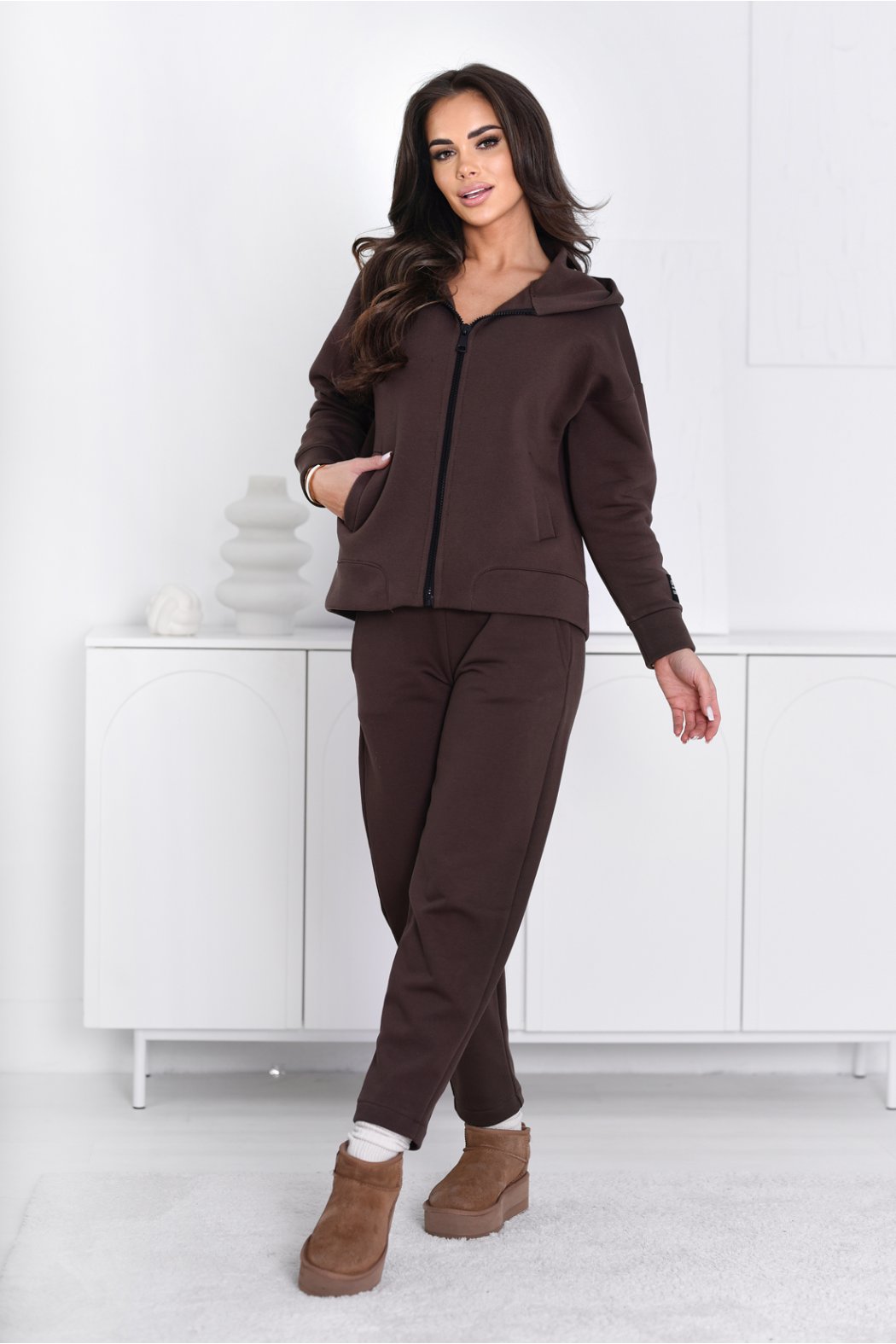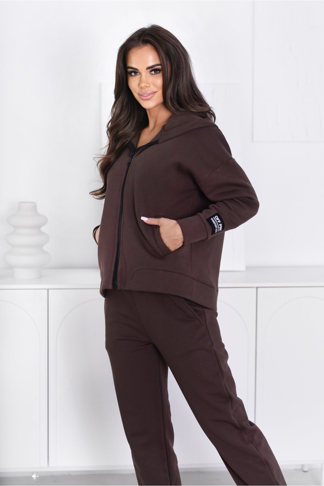 Postaw na komfort i styl! Ta damska bluza rozpinana została uszyta z grubej, drapanej bawełny, która jest wyjątkowo miękka i przyjemna w dotyku. Od wewnątrz wykończona delikatnym meszkiem, zapewnia ciepło i wygodę. Model posiada praktyczny kaptur oraz dwie pojemne kieszenie z przodu, na lewym rękawie znajduje się czarna, ozdobna naszywka nadająca bluzie sportowego charakteru. To idealny wybór dla kobiet, które cenią sobie swobodę, funkcjonalność i nowoczesny, sportowy design.