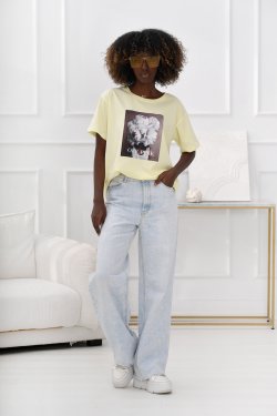 T-shirt damski z dużym nadrukiem. Model o prostym kroju zapewnia komfort noszenia i swobodę ruchów. Wykonany z wysokiej jakości dzianiny bawełnianej z domieszką elastanu, dzięki czemu jest miękki, oddychający i lekko elastyczny. Idealny wybór do codziennych i sportowych stylizacji. Świetnie komponuje się zarówno z jeansami, legginsami jak i spodenkami!