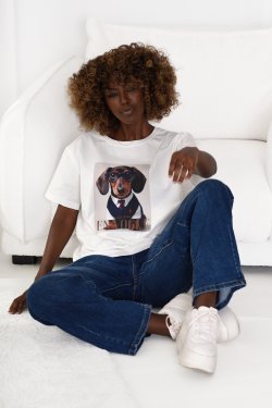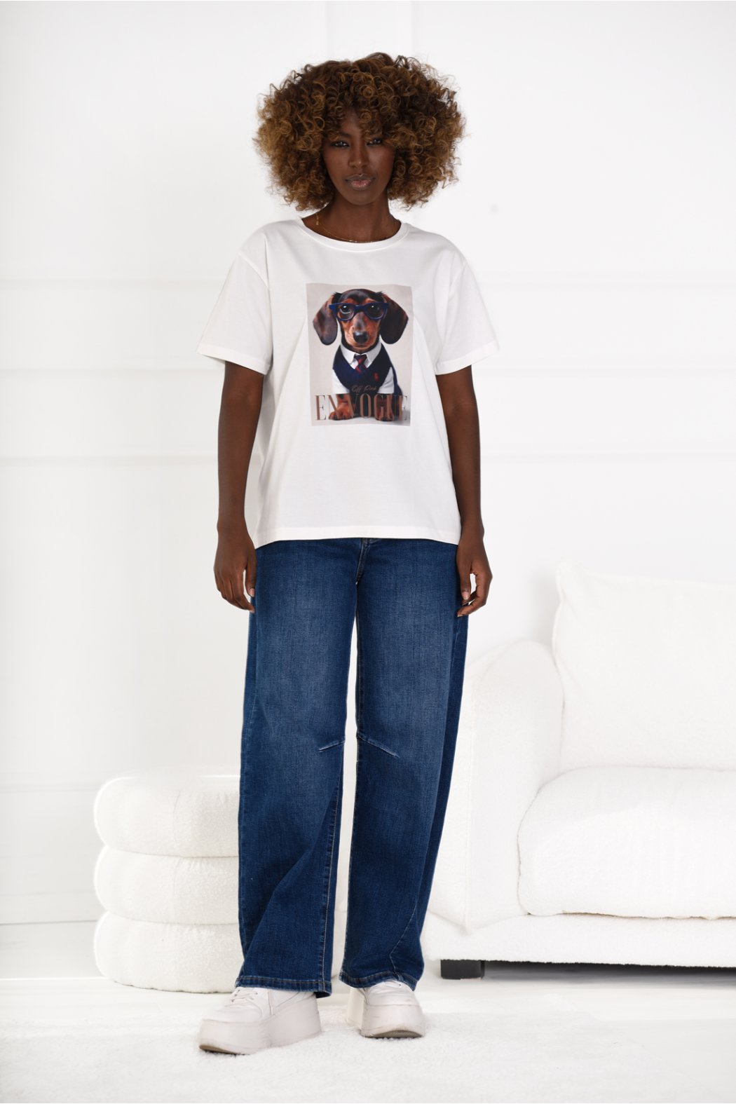T-shirt damski Arno z dużym nadrukiem. Model o prostym kroju zapewnia komfort noszenia i swobodę ruchów. Wykonany z wysokiej jakości dzianiny bawełnianej z domieszką elastanu, dzięki czemu jest miękki, oddychający i lekko elastyczny. Idealny wybór do codziennych i sportowych stylizacji. Świetnie komponuje się zarówno z jeansami, legginsami jak i spodenkami!